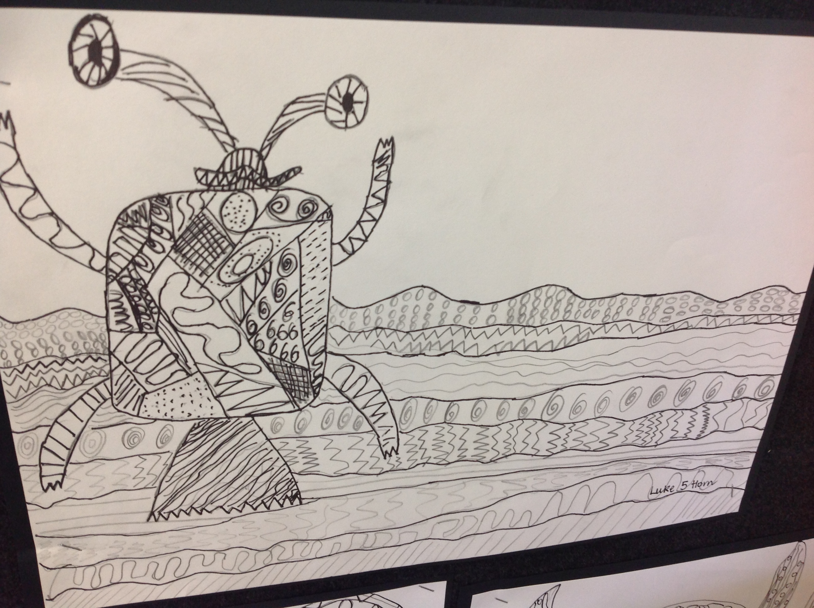 Students in Levels 3 and 4 explored bug X-rays and studied the shapes and patterns found in nature. It's exciting to see the use of detailed pattern in their work. The Level 5 and 6 students took the bug X-rays one step further and were challenged to look for another image. The results show our students have extremely creative minds and their black and white contrast work is outstanding.